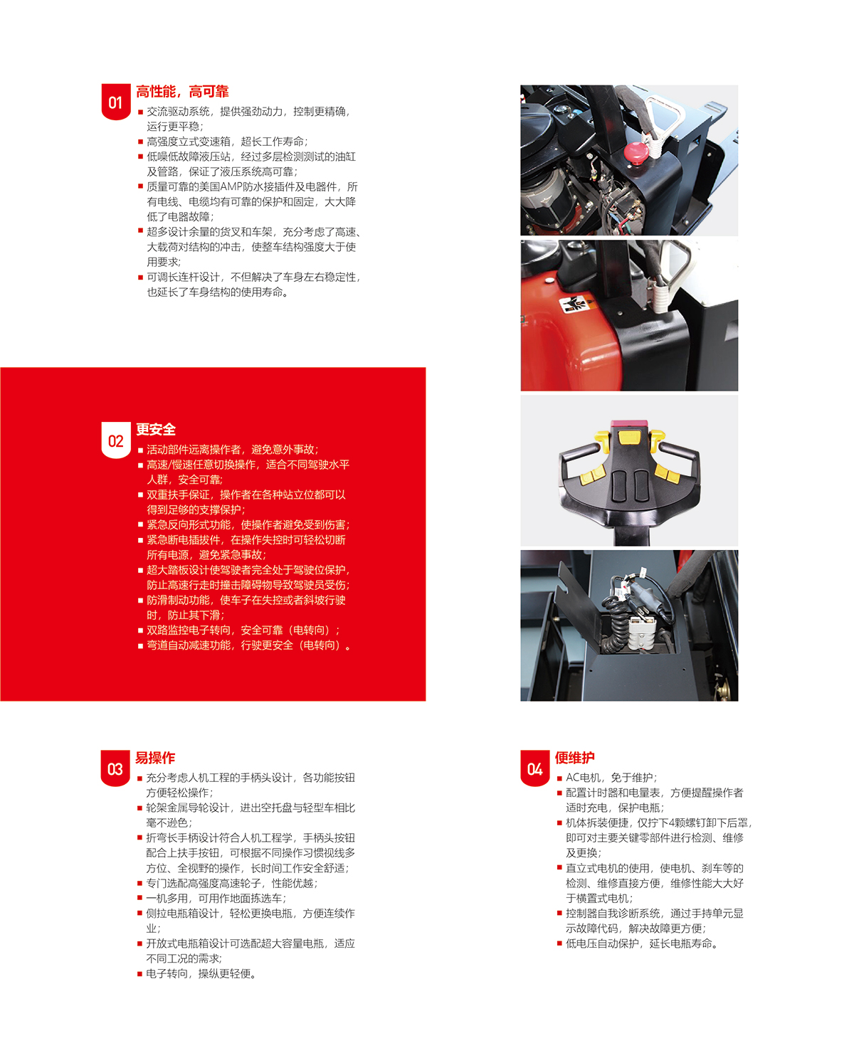 产品卖点: 高速高载搬运车,超强工况的理想选择载荷最大可到3.5T; 高速可达12KM/H; 双托盘货叉选配提供翻倍搬运效率;