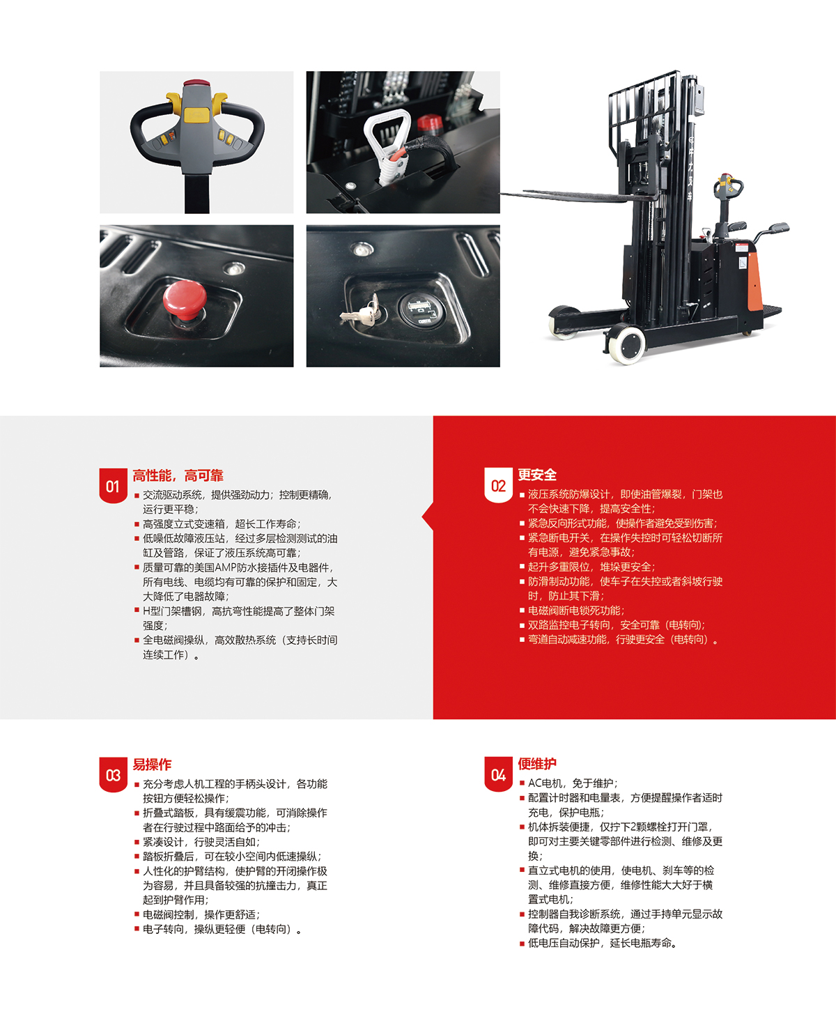 产品卖点: 狭窄通道、非标托盘、高位堆垛作业; 全电磁阀控制,操控精准可靠; 电转向控制,舒适高效;