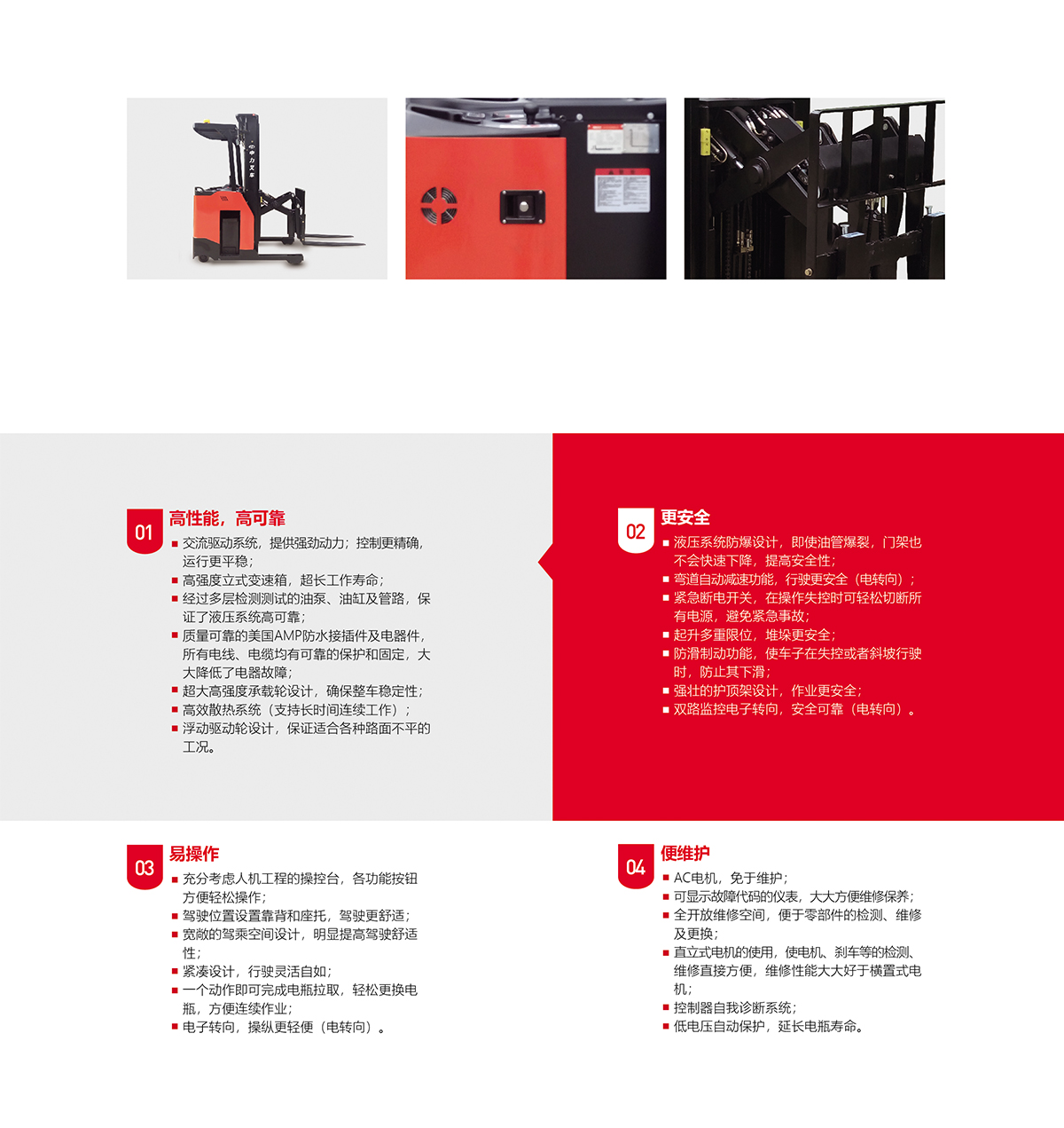 产品卖点: 窄通道、高货架货物堆垛的理想选择; 站驾操作,视野宽广,作业方便; 电转向控制,舒适高效;