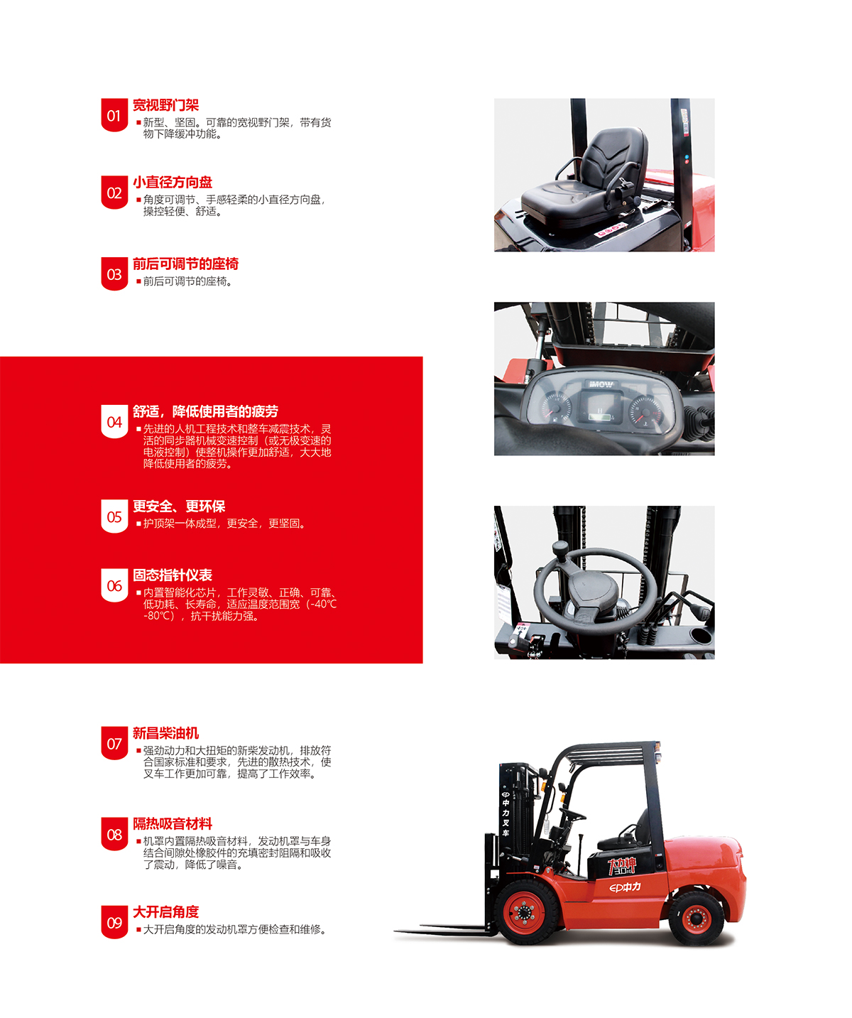 产品卖点: 宽视野门架,小直径方向盘; 可调节座椅; 安全、环保; 新昌柴油发动机